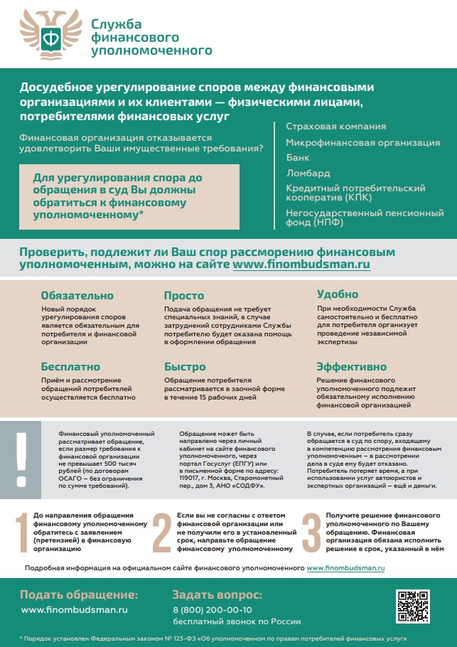 Суды больше не принимают иски от потребителей финансовых услуг с жалобами на действия финансовых организаций. Речь идет о спорах, которые подлежат урегулированию в досудебном порядке в соответствии с Федеральным законом «Об уполномоченном по правам потребителей финансовых услуг». Согласно ему, в большинстве случаев перед тем, как подавать иск суд на финансовую организацию, необходимо обратиться к финансовому уполномоченному Финансовый уполномоченный рассматривает споры со следующими финансовыми организациями: страховые компании, банки, микрофинансовые организации (МФО), ломбарды, кредитные потребительские кооперативы (КПК), негосударственные пенсионные фонды (НПФ). Проверить, подлежит ли ваш спор рассмотрению финансовым уполномоченным можно с помощью специального сервиса, ответив на несколько простых вопросов. В случае, если потребитель сразу обращается в суд по спору, входящему в компетенцию финансового уполномоченного – в рассмотрении дела в суде ему будет отказано. Потребитель потеряет время, а при использовании услуг автоюристов и экспертных организаций – ещё и деньги. Досудебный порядок является обязательным и бесплатным для потребителя, госпошлина отсутствует. Сроки рассмотрения обращения в разы меньше в сравнении со сроками рассмотрения судебного иска. Решение финансового уполномоченного подлежит обязательному исполнению финансовой организацией. Подача обращения не требует от потребителя специальных знаний, в случае затруднений сотрудниками Службы финансового уполномоченного ему будет оказана помощь в оформлении обращения. При необходимости Служба самостоятельно и бесплатно для потребителя организует проведение независимой экспертизы. Более подробную информацию по порядку обращения можно найти на официальном сайте финансового уполномоченного www.finombudsman.ru в разделе База знаний или узнать в контактном центре по телефону 8 800 200-00-10 (звонок по России бесплатный). |